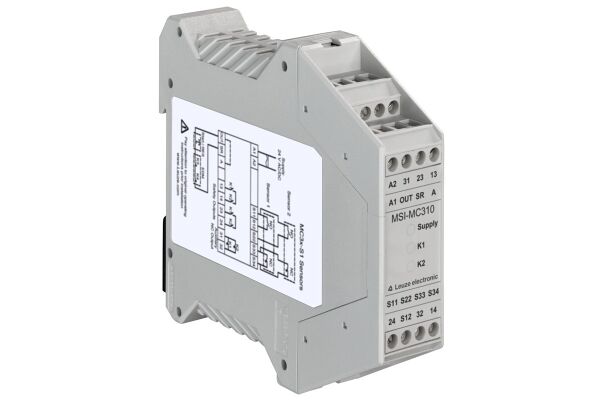 Safety relay designed as an evaluation unit for magnetically coded sensors with antivalent reed contacts. It features start/restart interlock (RES), stop category 0, and static contactor monitoring (EDM).