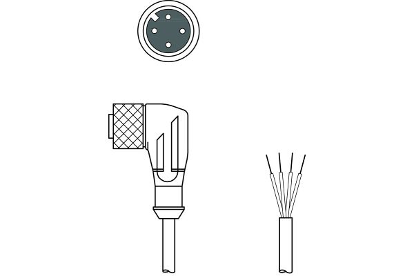 A connection cable featuring an M12, angled, female, A-coded, 4-pin connector on one end and an open end on the other. It has a PVC sheathing material with a cable length of 2,000 mm and is not shielded.