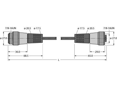 Bus Cable for CAN (DeviceNet, CANopen), PVC Cable Jacket, Voltage 300 V, Cable length 2 m, Jacket material: PVC, Jacket color: gray, UL approval, 7/8" female, straight, 7/8" male, straight, Cable length: 2.0 m