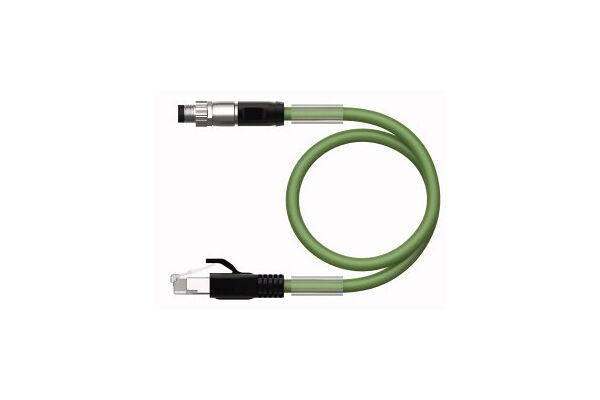 Industrial Ethernet/PROFINET Cable, Extension Cable, Cable length 2 m, M8 male connector, straight, RJ45 male connector, straight, 4-pin, Ethernet cable: 4-pin, AWG 22, CAT 5E, Jacket material: PUR, Jacket color: green, Shielding: overlapping aluminum foil, tinned copper wire, Jacket diameter: 6.5 mm, Suitable for drag chain use, Oil resistant acc. to IEC 60811-2-1 and UL13, Halogen free acc. to IEC 60754, Flame retardant acc. to IEC 60332-1-2 and UL2556 VW1, Approval: UL, RoHS compliant, PNO compliant, Cable length: 2.0 m