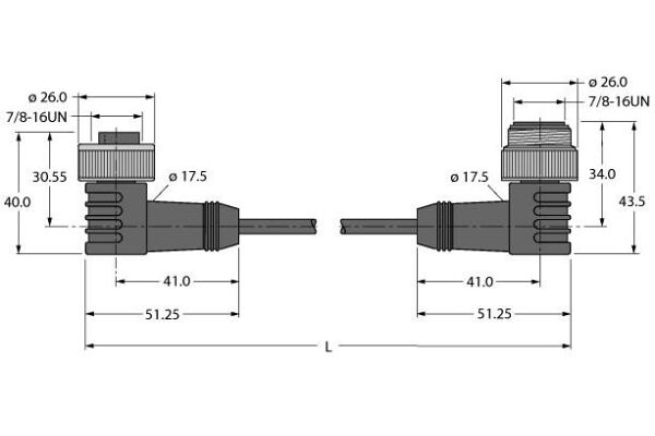 Power Supply Cable, PUR, Extension Cable, Voltage 240 V, Cable length 0.5 m, Power cable: 5 × 1.5 mm2, Jacket material: PUR, color: gray, Jacket diameter: 8.5 mm, Suitable for drag chain use, Oil resistant and flame retardant, Halogen free, 7/8" male, angled, 7/8" female, angled, Cable length: 0.5 m