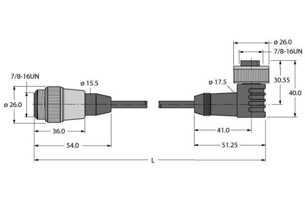 Power Cable, Extension Cable, Voltage 600 V, Cable length 5 m, Power cable: 2 × 0.83 mm2, 2 × 18 AWG, Jacket material: PVC, Jacket color: yellow, Jacket diameter: 6.2 mm, UV resistant, Flame retardant acc. to CSA FT4, UL, CSA approval, RoHS compliant, Protection class: NEMA 1, 3, 4, 6P and IEC IP67, 7/8" female, angled, 7/8" male, straight, Cable length: 5.0 m
