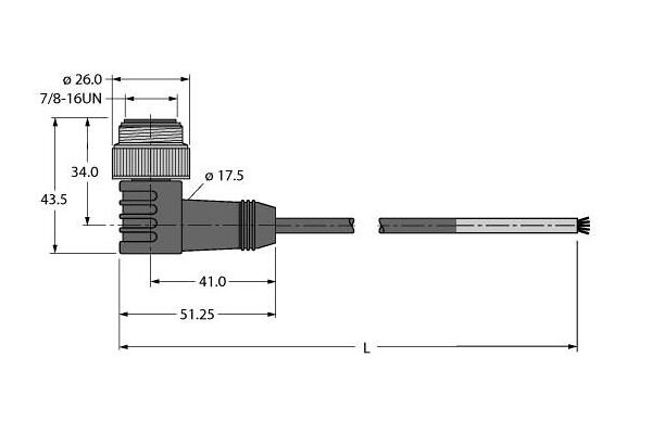 Power Supply Cable, PUR, Connection Cable, Voltage 240 V, Cable length 15 m, Power cable: 5 × 1.5 mm2, Jacket material: PUR, color: gray, Jacket diameter: 8.5 mm, Suitable for drag chain use, Oil resistant and flame retardant, Halogen free, End open, 7/8" male, angled, Cable length: 15 m