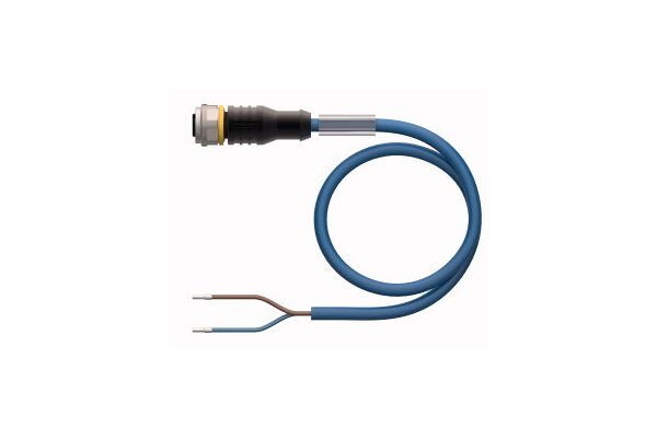 Actuator and Sensor Cable, PUR, Connection Cable, Voltage 250 V, Cable length 30 m, Female M12, straight, 2-pin, Jacket material: PUR, Jacket color: blue, Suitable for drag chain use, Resistant to chemicals, UV radiation and oils, Flame retardant (FT2 acc. to UL 1581, IEC 60332-2-2), Resistant to welding sparks, Free from halogen, silicone, PVC and LABS, Particularly resistant to abrasion, Protection class: IP67, IP69K, Cable length: 30 m