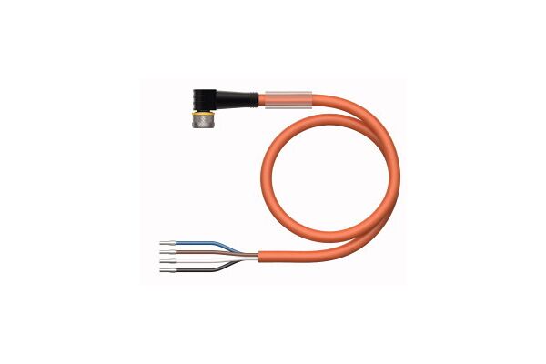 Actuator and Sensor Cable, PUR, Connection Cable, Rated voltage [Umax] 60 VDC / 50 VAC, Cable length 2 m, Female M8, angled, 4-pin, Jacket material: PUR, Jacket color: orange, Suitable for drag chain use, Resistant to chemicals, UV radiation and oils, Flame retardant (FT2 acc. to UL 1581, IEC 60332-2-2), Resistant to welding sparks, Free from halogen, silicone, PVC and LABS, Particularly resistant to abrasion, Protection class: IP67, IP69K, Cable length: 2.0 m