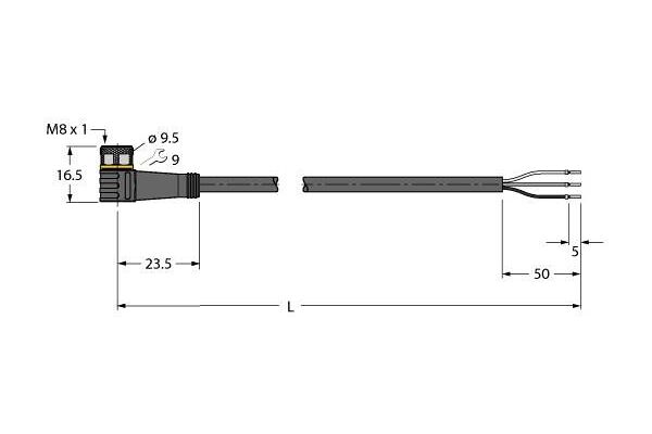 Actuator and Sensor Cable, PUR, Connection Cable, Rated voltage [Umax] 60 VDC / 50 VAC, Cable length 6 m, Female M8, angled, 3-pin, Jacket material: PUR, Jacket color: black, Suitable for drag chain use, Resistant to chemicals, UV radiation and oils, Flame retardant (FT2 acc. to UL 1581, IEC 60332-2-2), Resistant to welding sparks, Free from halogen, silicone, PVC and LABS, Particularly resistant to abrasion, Protection class: IP67, IP69K, Cable length: 6.0 m