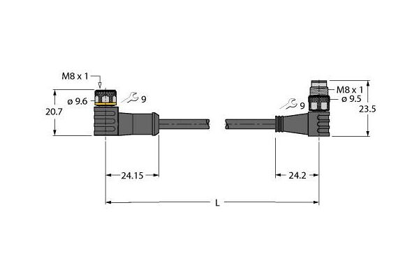 Actuator and Sensor Cable, PUR, Extension Cable, Rated voltage [Umax] 30 VDC, Cable length 5 m, Female M8, angled, 3-pin, With 2-color LED (PNP, yellow, green), Male M8, angled, 3-pin, Jacket material: PUR, Jacket color: black, Suitable for drag chain use, Resistant to chemicals, UV radiation and oils, Flame retardant (FT2 acc. to UL 1581, IEC 60332-2-2), Resistant to welding sparks, Free from halogen, silicone, PVC and LABS, Particularly resistant to abrasion, Protection class: IP67, IP69K, Cable length: 5.0 m