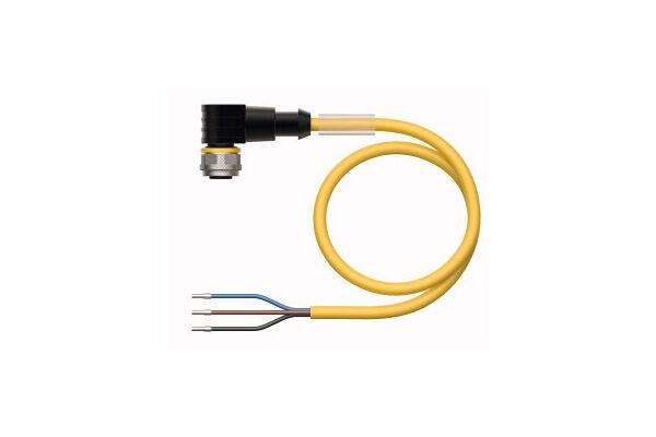 Actuator and Sensor Cable, PVC, Connection Cable, Voltage 250 V, Cable length 5 m, Female M12, angled, 3-pin, Jacket material: PVC, Jacket color: yellow, Resistant to chemicals and oils, Flame retardant, Resistant to acids and alkaline solutions, Resistant to microbes and hydrolysis, LABS free, Protection class: IP67, IP69K, Cable length: 5.0 m
