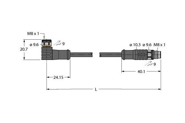 Actuator and Sensor Cable, PVC, Extension Cable, Rated voltage [Umax] 60 VDC / 50 VAC, Cable length 0.6 m, Female M8, angled, 3-pin, Shield on coupling nut/screw, Male M8, straight, 3-pin, Jacket material: PVC, shielded, Jacket color: black, Resistant to chemicals and oils, Flame retardant, Resistant to acids and alkaline solutions, Resistant to microbes and hydrolysis, LABS free, Protection class: IP67, IP69K, Cable length: 0.6 m