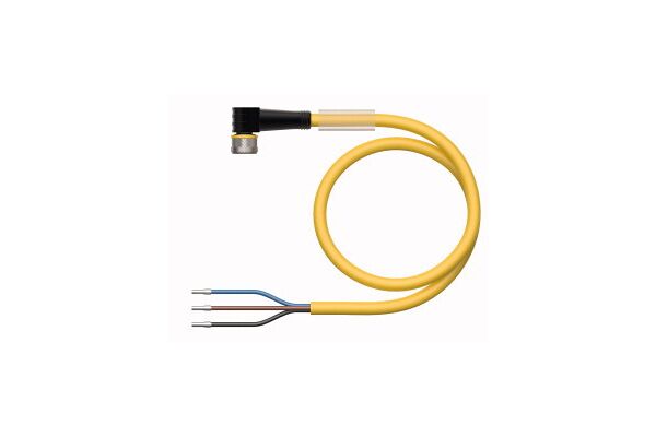 Actuator and Sensor Cable, PVC, Connection Cable, Rated voltage [Umax] 60 VDC / 50 VAC, Cable length 2 m, Female M8, angled, 3-pin, Jacket material: PVC, Jacket color: yellow, Resistant to chemicals and oils, Flame retardant, Resistant to acids and alkaline solutions, Resistant to microbes and hydrolysis, LABS free, Protection class: IP67, IP69K, Cable length: 2.0 m