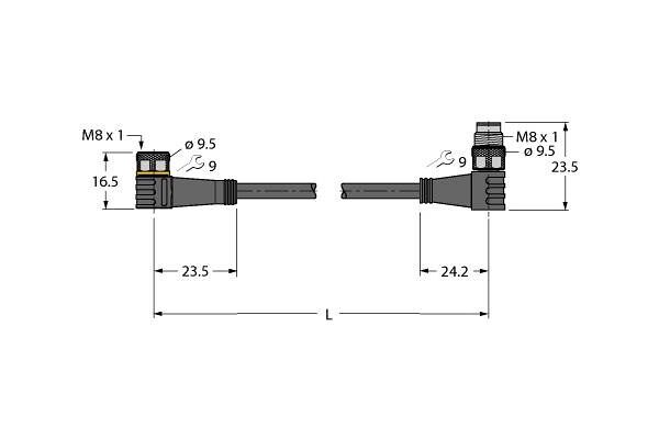 Actuator and Sensor Cable, PVC, Extension Cable, Rated voltage [Umax] 60 VDC / 50 VAC, Cable length 0.3 m, Female M8, angled, 3-pin, Male M8, angled, 3-pin, Jacket material: PVC, Jacket color: black, Resistant to chemicals and oils, Flame retardant, Resistant to acids and alkaline solutions, Resistant to microbes and hydrolysis, LABS free, Protection class: IP67, IP69K, Cable length: 0.3 m