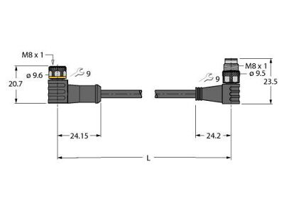 Actuator and Sensor Cable, PUR, Extension Cable, Rated voltage [Umax] 30 VDC, Cable length 1 m, Female M8, angled, 3-pin, With 2-color LED (PNP, yellow, green), Male M8, straight, 3-pin, Jacket material: PUR, Jacket color: black, Suitable for drag chain use, Resistant to chemicals, UV radiation and oils, Flame retardant (FT2 acc. to UL 1581, IEC 60332-2-2), Resistant to welding sparks, Free from halogen, silicone, PVC and LABS, Particularly resistant to abrasion, Protection class: IP67, IP69K, Cable length: 1.0 m