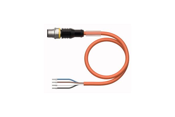 Actuator and Sensor Cable, PUR, Connection Cable, Voltage 250 V, Cable length 2 m, Male M12, straight, 4-pin, Jacket material: PUR, Jacket color: orange, Suitable for drag chain use, Resistant to welding sparks, Resistant to chemicals, UV radiation and oils, Flame retardant (FT2 acc. to UL 1581, IEC 60332-2-2), Free from halogen, silicone, PVC and LABS, Particularly resistant to abrasion, Protection class: IP67, IP69K, Cable length: 2.0 m