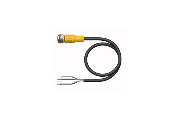 Actuator and Sensor Cable, PUR, Connection Cable, Voltage 250 V, Cable length 5 m, Female M12, straight, 4-pin, Jacket material: PUR, Jacket color: black, Grip color: yellow, Suitable for drag chain use, Resistant to chemicals, UV radiation and oils, Flame retardant (FT2 acc. to UL 1581, IEC 60332-2-2), Free from halogen, silicone, PVC and LABS, Particularly resistant to abrasion, Protection class: IP67, IP69K, Cable length: 5.0 m