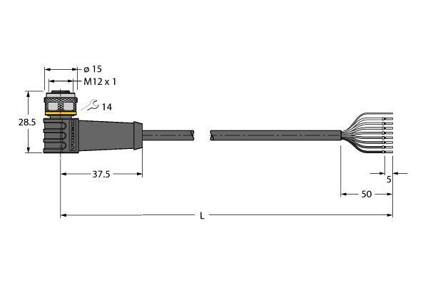 Actuator and Sensor Cable, PVC, Connection Cable, Voltage 30 V, Cable length 15 m, Female M12, angled, 8-pin, Shield on coupling nut/screw, Jacket material: PVC, shielded, Jacket color: black, Resistant to chemicals and oils, Flame retardant, Resistant to acids and alkaline solutions, Resistant to microbes and hydrolysis, LABS free, Protection class: IP67, IP69K, Cable length: 15 m