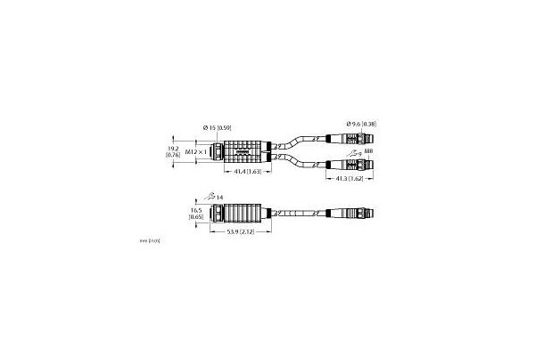 2-Way Splitter, Y-Splitter with Cable, Female M12 × 1 - 2x Male M8 × 1, Voltage 48 V, Cable length 2 m, Jacket material: PUR, Jacket color: black, Suitable for drag chain use, Resistant to chemicals, UV radiation and oils, Flame-retardant (FT2 in accordance with UL 1581, IEC 60332-2-2), Free from halogen, silicone, PVC and LABS, Particularly resistant to abrasion, RoHS-compliant, Protection class: IP67, 4/3-pin, Cable length: 2.0/2.0 meter