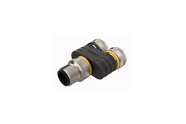 2-Way Splitter, Y-Splitter without Cable, Male Connector — 2 × Female Connectors, Voltage 60 V, M12 male connector, 5-pin, 2 × M12 female connector, 5-pin, Wired in parallel, RoHS compliant, Protection class: IP67