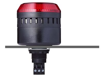 The Ø 65 mm panel-mount buzzer features a steady beacon with a maximum sound pressure of 103 dB (A) that is infinitely adjustable. It offers a high degree of protection (IP 65) and is compatible with panel sizes Ø 22.5 mm/M22, with an adapter available for M30.5 mm. The steady tone and LED light can be switched separately, and it utilizes user-friendly connection technology.