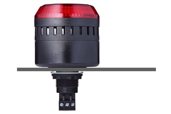 The Ø 65 mm panel-mount buzzer features a LED steady/flashing beacon and delivers a maximum sound pressure of 103 dB (A). With an infinitely adjustable tone, it offers a high degree of protection (IP 65) and user-friendly connection technology. It supports various tones, including pulsing or wobble with LED flashing light and steady tone with LED steady light. Compatible with panel sizes Ø 22.5 mm/M22, an adapter for M30.5 mm is also available.