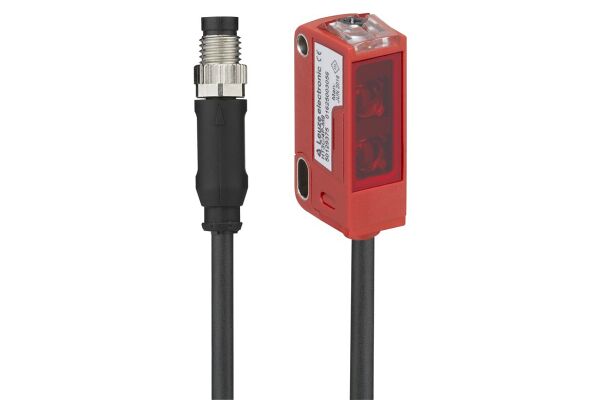 This is a diffuse sensor with background suppression, featuring a red laser light source and two digital switching outputs. It operates with a supply voltage of 10 to 30 V DC and is housed in a compact cubic plastic design.