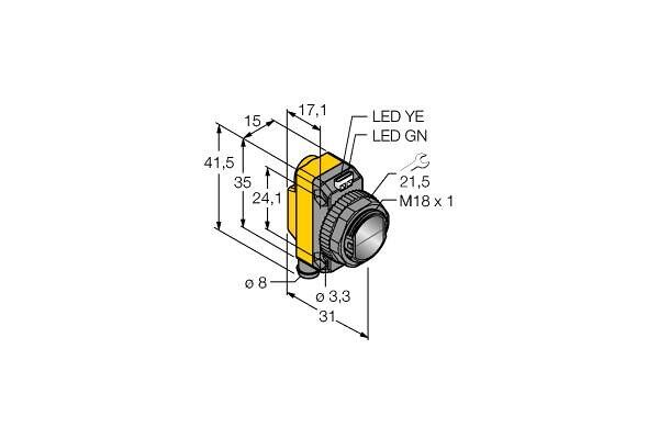 Photoelectric Sensor, Diffuse Mode Laser Sensor, Operating voltage 10…30 VDC, Max. range 300 mm, Male connector, M8 × 1, 4-pin, Protection class IP67, LED all-round visible, Sensitivity adjusted via potentiometer, Operating voltage: 10…30 VDC, PNP switching output, changeover