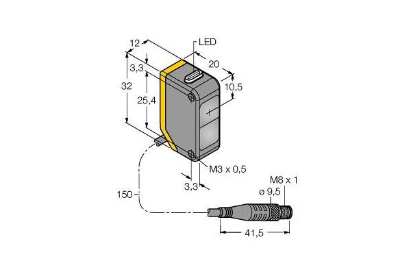 Photoelectric Sensor, Opposed Mode Sensor (Emitter), Operating voltage 10…30 VDC, Max. range 12000 mm, Cable length 0.15 m, Cable with male end, PVC, M8 × 1, 4-pin, 150 mm, Protection class IP67, LED, all-round visible, Operating voltage: 10…30 VDC