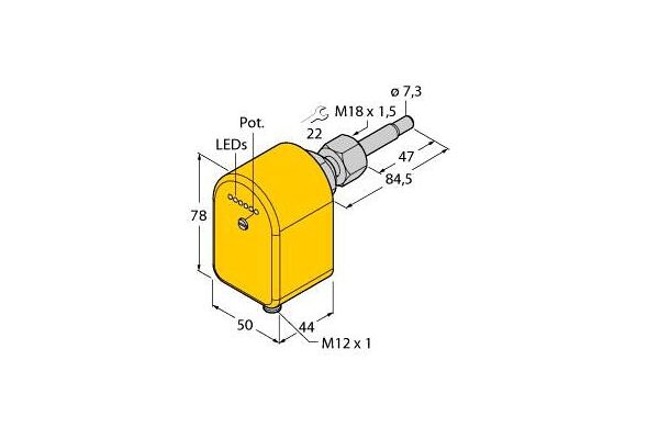 Freely Rotatable FCST Flow Sensor, Monitoring of Flow Speed, Analog Output 4…20 mA Linearized for Water, Operating voltage 21.6…26.4 VDC, Immersion sensor, Thermodynamic operating principle, Flow monitoring, Switchpoint freely adjustable, Adjusted via potentiometer, LED band for indications, Analog output 4…20 mA, Linearized for water, Freely rotatable sensor, Plugged in with adapter, Screw-in adapter, M18 x 1.5