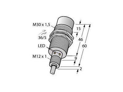 Inductive Sensor, For the Food Industry, Operating voltage 10…30 VDC, Rated switching distance 30 mm, Non-flush, Cable length 2 m, Threaded barrel, M30 x 1.5, Stainless steel, 1.4404, Front cap made of liquid crystal polymer, Factor 1 for all metals, Resistant to magnetic fields, For temperatures of -40 °C…+100 °C, High protection class IP69K for harsh environments, Special double-lip seal, Protection against all common acidic and alkaline cleaning agents, Laser engraved label, permanently legible, DC 3-wire, 10…30 VDC, NO contact, NPN output, Cable connection